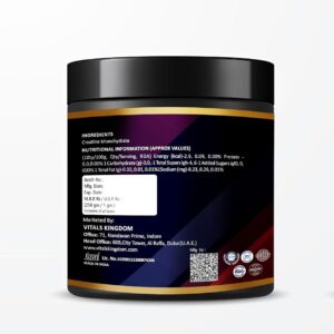 Vitals Kingdom Micronized Creatine Monohydrate is a premium dietary supplement designed to help fitness enthusiasts, athletes, and bodybuilders elevate their performance and reach their muscle-building goals. Each serving delivers 5g of ultra-micronized, unflavored creatine monohydrate, which dissolves easily and gets absorbed quickly for maximum strength, endurance, and recovery.